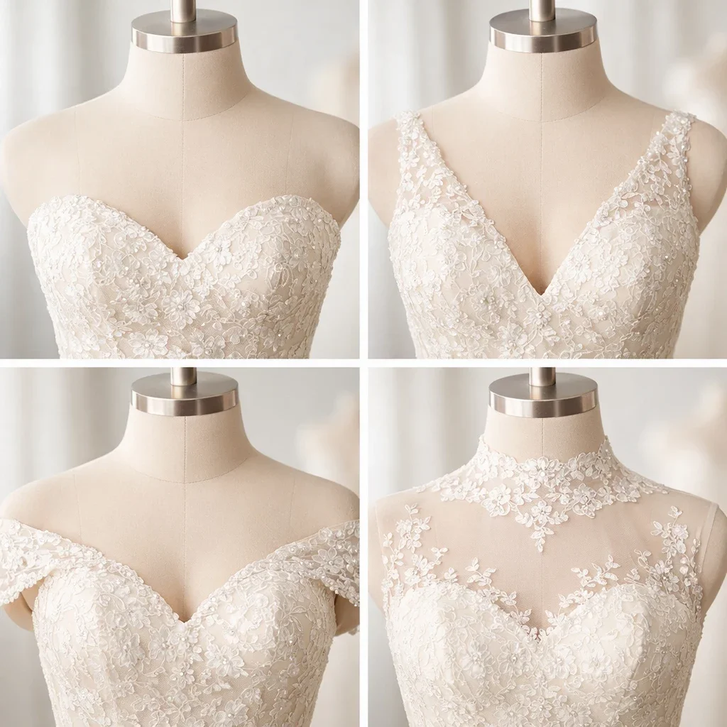Your neckline sets the tone for your entire look. A sweetheart neckline reads romantic; a high neck reads editorial. Here's a breakdown of the most popular options and what each one communicates.
